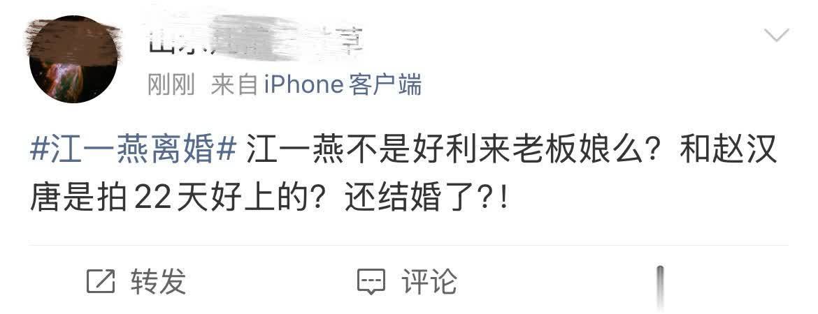 有网友评论道:“江一燕不是好利来老板娘么?和赵汉唐是拍《22天》好上的?还结婚了?”